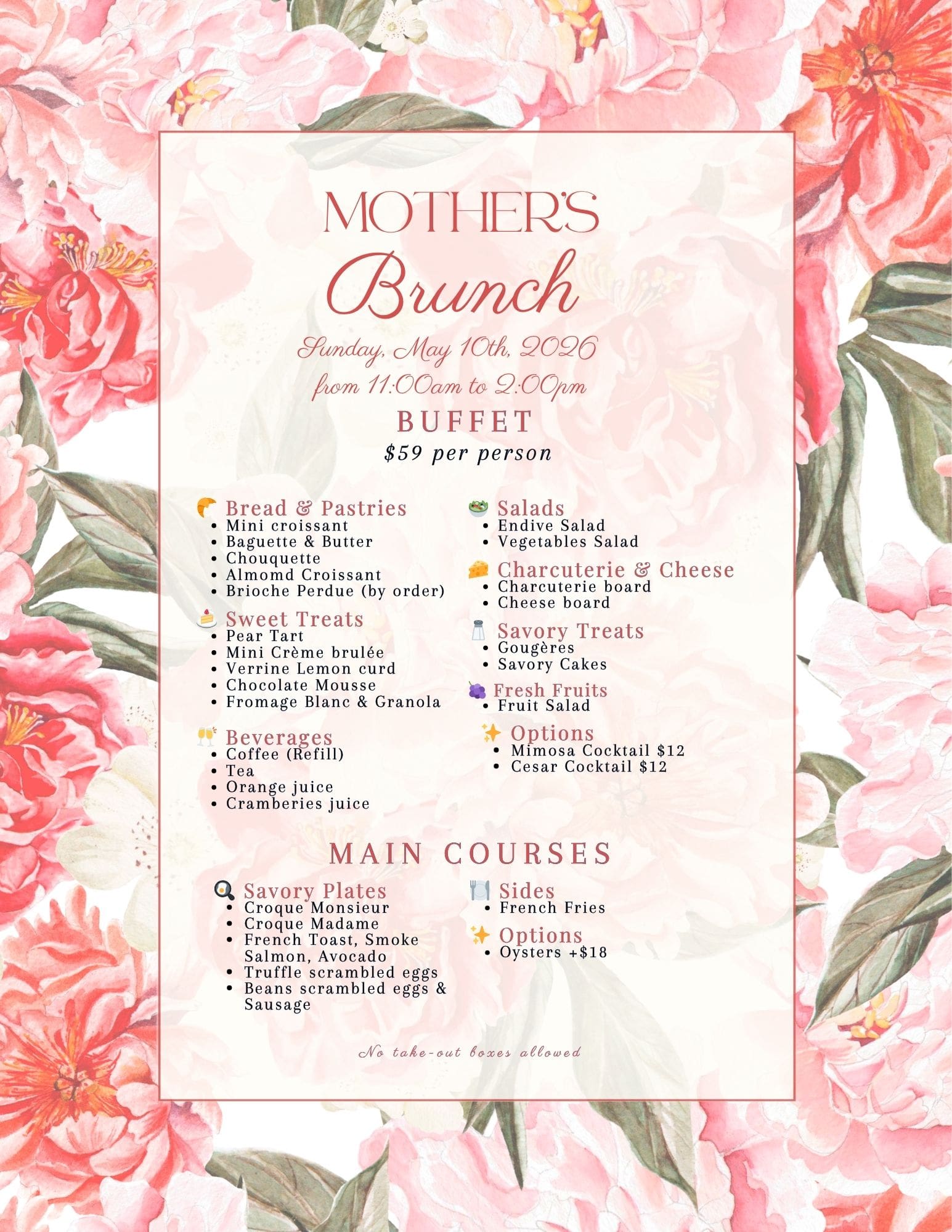 🍽️ Menu: Mother’s Sunday Brunch buffet $59 per person (see Menu)